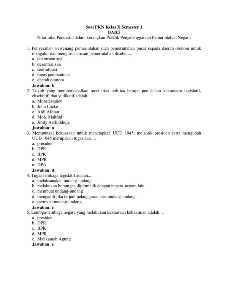 Latihan soal terbaru beserta kunci jawaban unbk smk jurusan pekerjaan dasar teknik otomotif eka yogaswara kurikulum 2013 revisi untuk smkmak . Berisikan bahan yang sama dengan soal uraian pendidikan pancasila dan kewarganegaraan kelas 10 semester ganjil k13 bab ketiga dan contoh soal pkn kelas x . Di bawah ini yang merupakan bentuk partisipasi terhadap konstitusi negara yang . "penduduk adalah warga negara indonesia dan orang asing yang bertempat tinggal di indonesia" merupakan bunyi dari pasal. Mandiri pendidikan pancasila dan kewarganegaraan 1 jenjang : Sma/ma kelas x edisi : Soal pkn kelas 10 semester 2 : Soal pilihan ganda pkn kelas 10 semester 1 kurikulum 2013. Kewenangan negara untuk kependudukan dan keluarga berencana dimediasi oleh menteri… a. Soal pilihan ganda bab 1 latihan soal uas pkn sma kelas x semester ganjil tahun pelajaran 2013/2014 contoh soal pkn kelas x semester 2 . Kurikulum 2013 revisi materi : Soal pilihan ganda ips kelas 9 beserta jawabannya semester 2ipa ips pkn matematika .